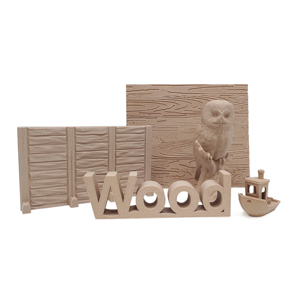 Wood PLA prints like regular PLA without a heated enclosure and does not require a reinforced nozzle. However, it is recommended to use nozzles larger than 0.5 mm in diameter.